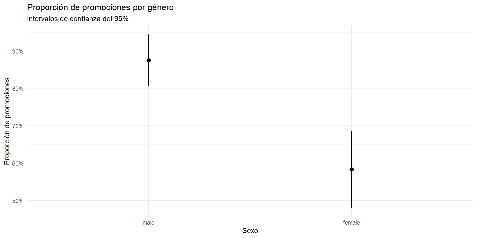 scale_y_continuous(labels = scales::percent) La Figura 2 muestra que la hipótesis nula se puede rechazar con un nivel de significancia del 5%, porque los intervalos de confianza no se traslapan.