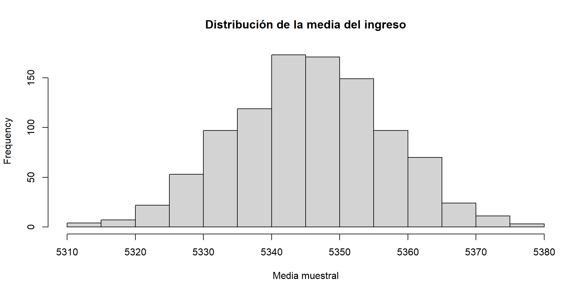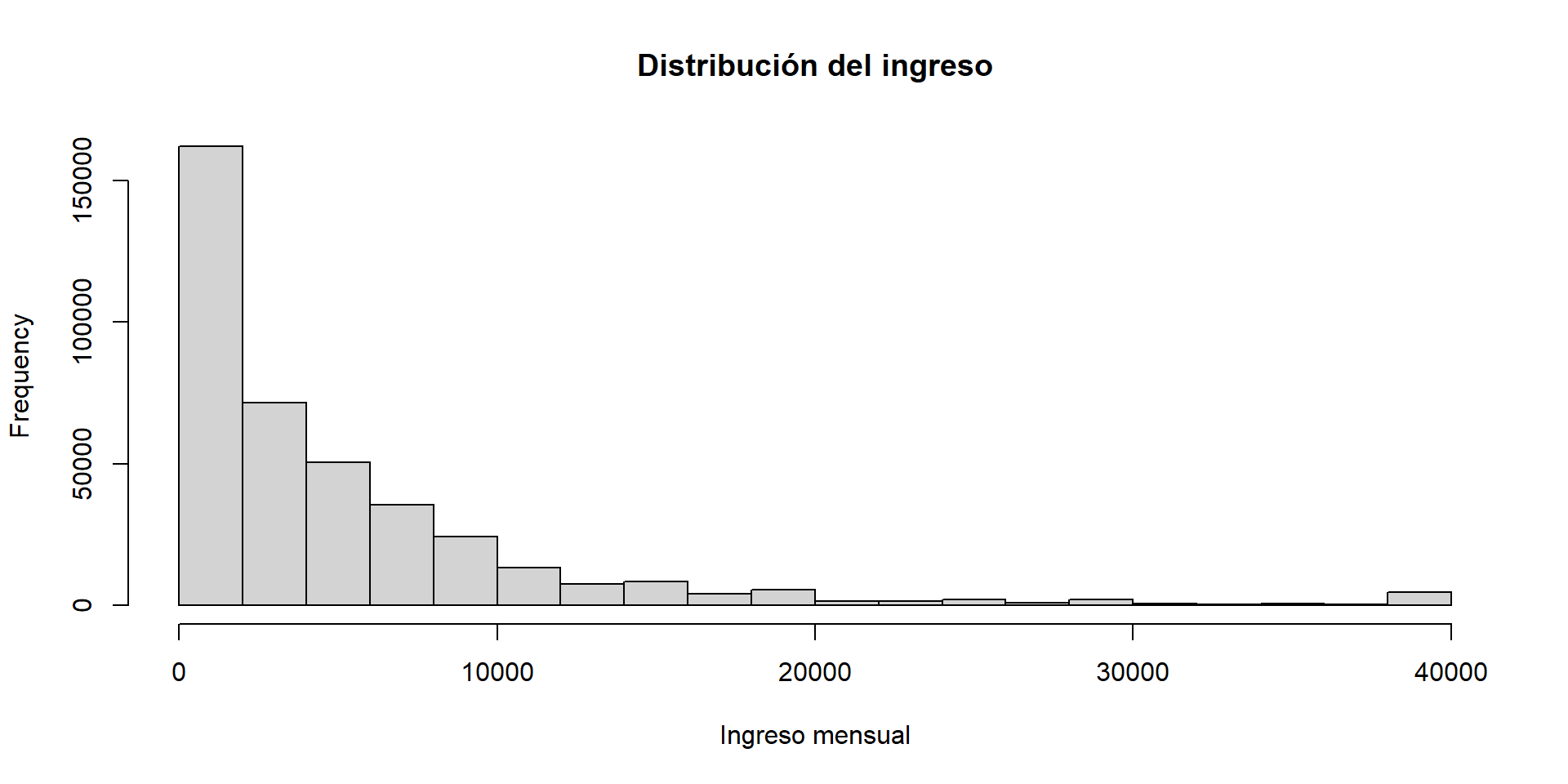 hist(ingresos, main = "Distribución del ingreso", xlab = "Ingreso mensual")