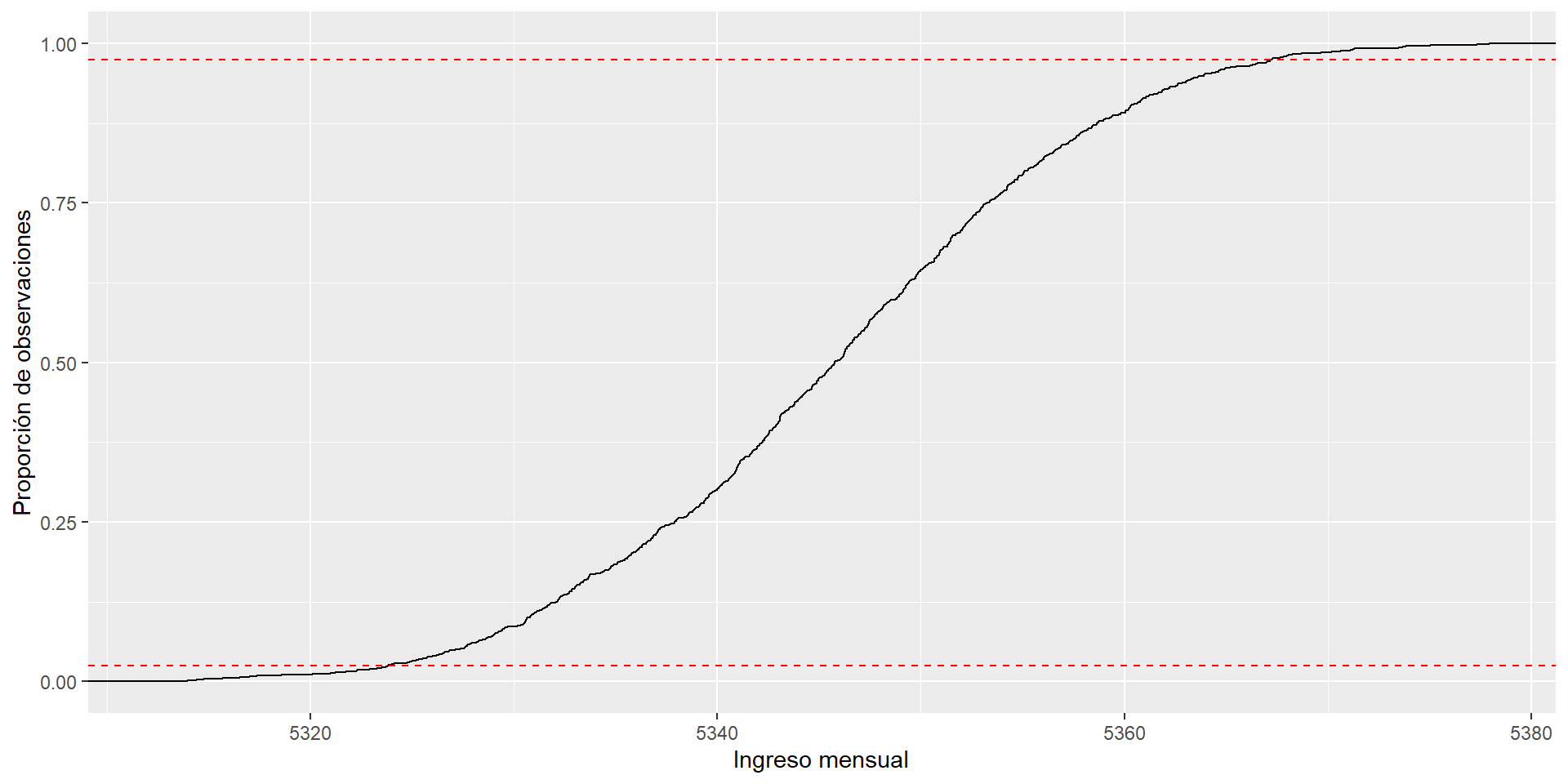 Para encontrar los valores del ingreso que acumulen el 95% de probabilidad de contener el verdadero valor del parámetro de interés, el promedio poblacional \(\mu\), usamos la siguiente fórmula: