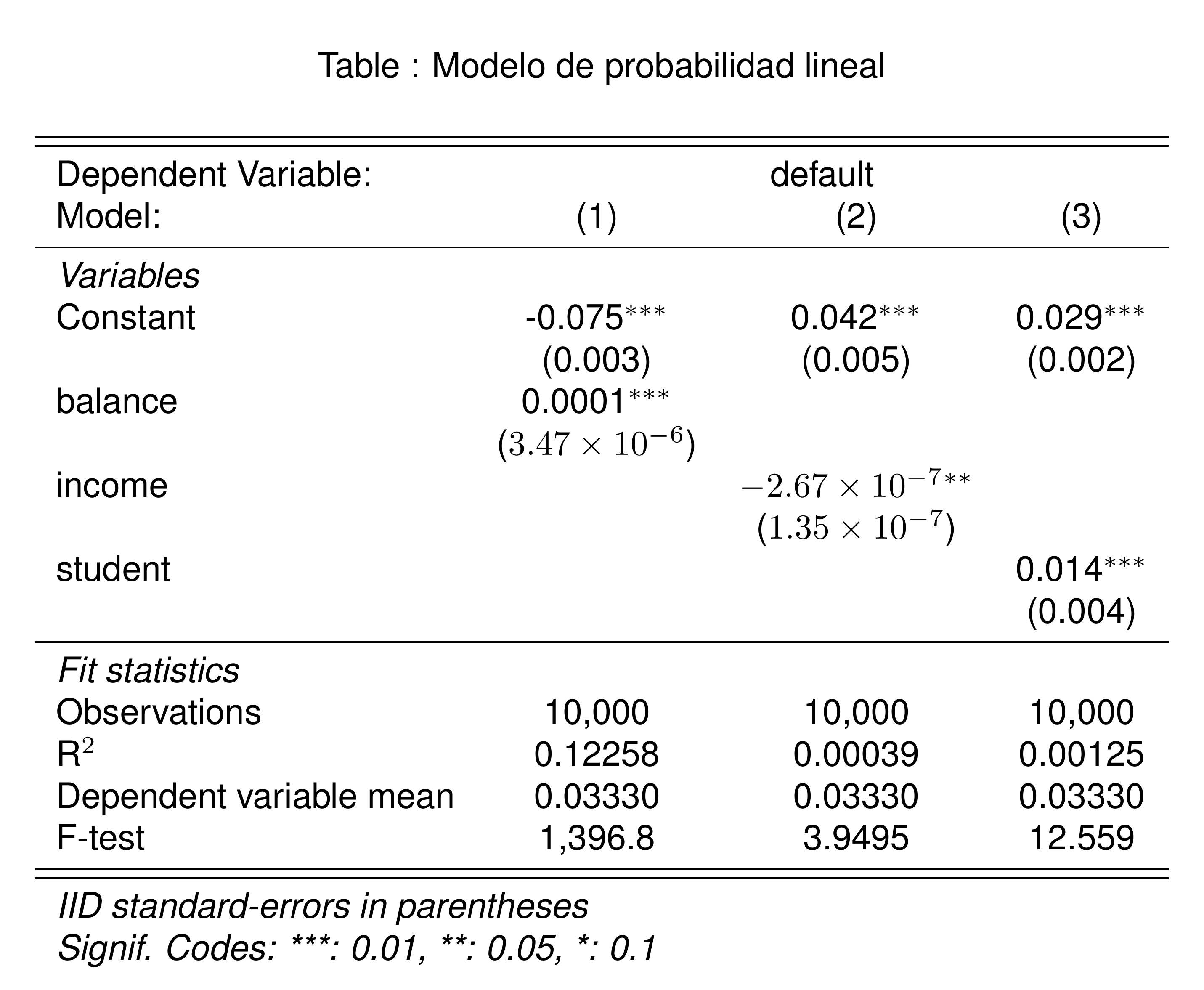 Para modelar la probabilidad de incumplimiento con OLS, usamos la siguiente especificación:
