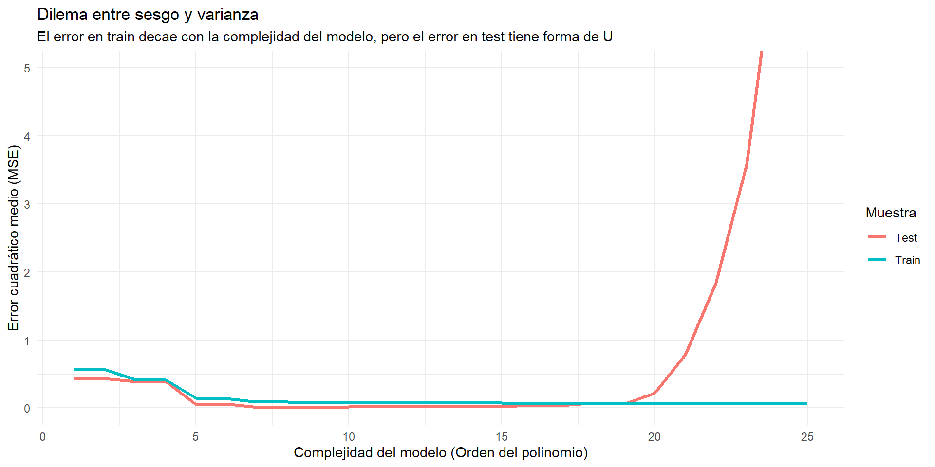 Una vez que llegamos a un cierto nivel de complejidad, el error en la muestra de prueba empieza a aumentar.