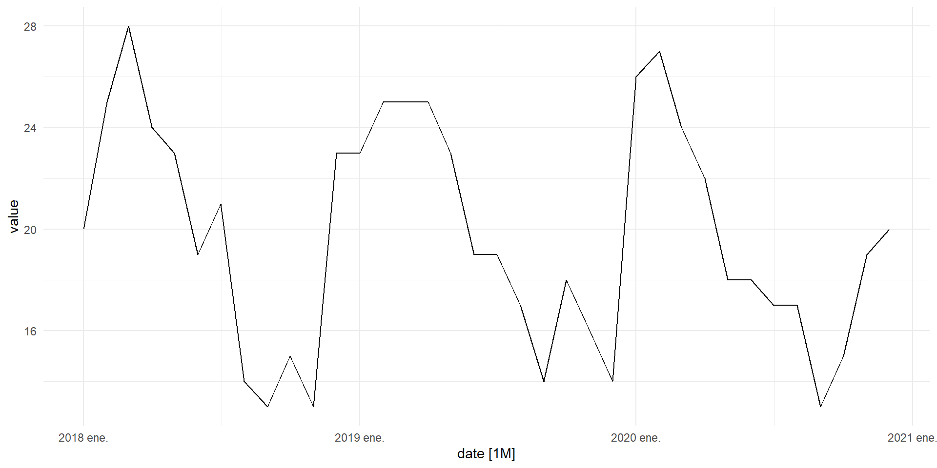 Simularemos datos del número de incumplimientos de deuda en el tiempo.