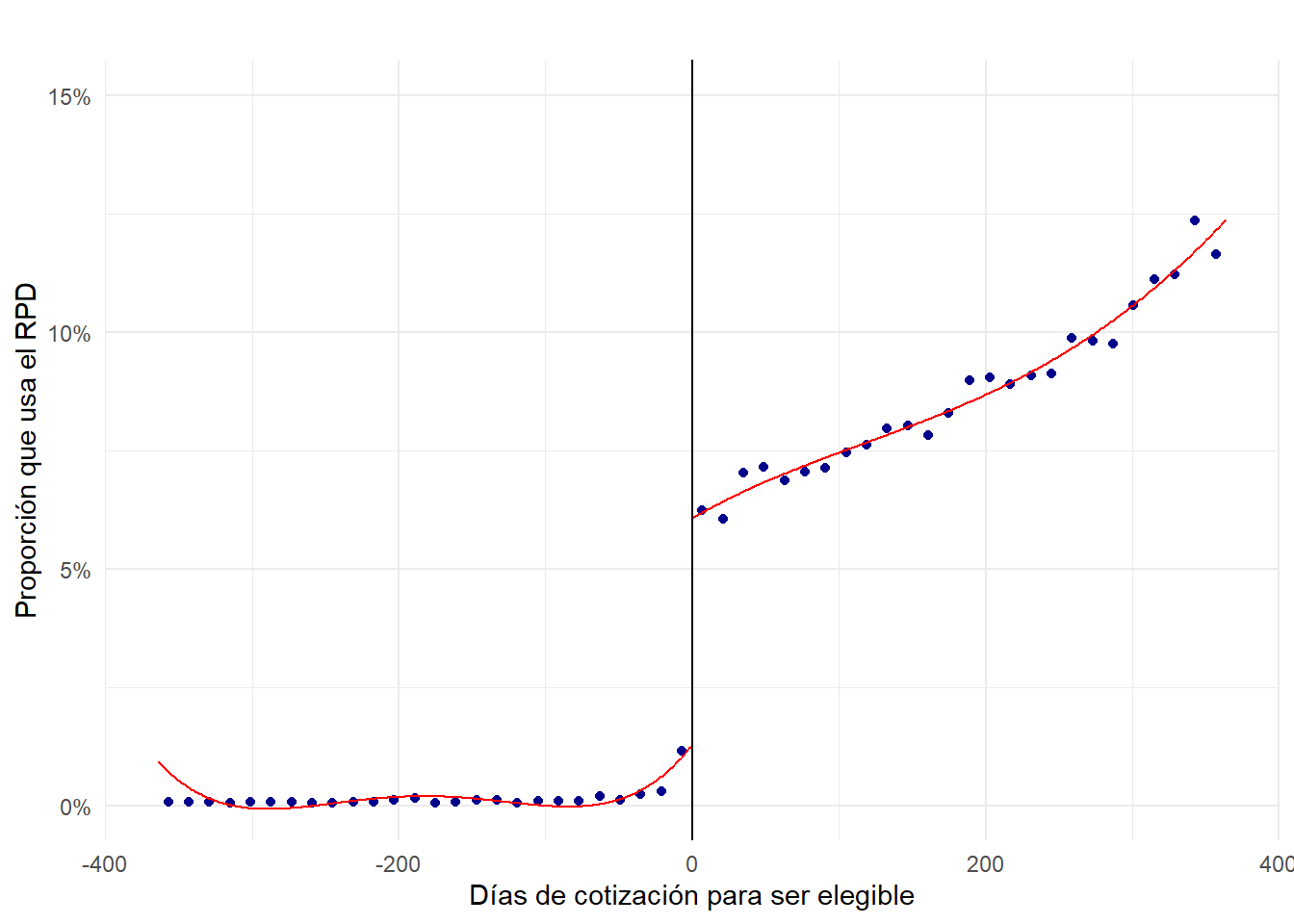 Esa discontinuidad funciona como un experimento natural. Al observar lo que ocurre justo alrededor del umbral, puedo identificar el efecto causal del acceso al RPD, aislándolo de otras características del trabajador.